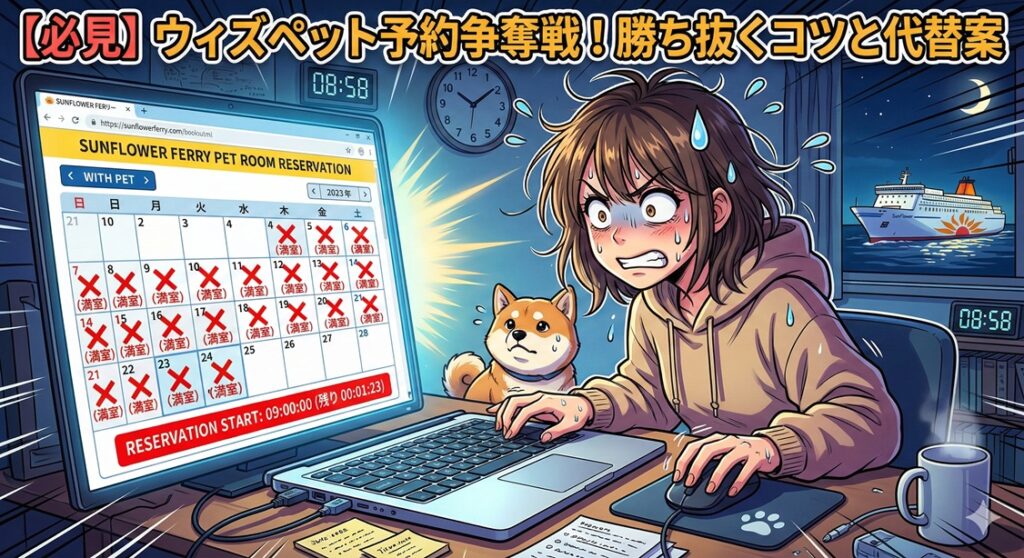 【必見】さんふらわあの「ウィズペット」は本当に予約取れない?激戦を勝ち抜くコツと代替案「愛犬と一緒にフェリーで九州旅行へ行きたい!」 そう思って、さんふらわあの公式サイトを開いたものの……「ウィズペット」のお部屋がカレンダー上でずっと『×(満室)… -