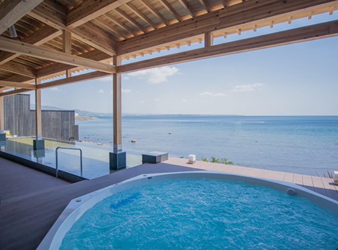 湯船の縁が海へと続いているかのような設計で、まるで海に直接浸かっているような感覚に陥ります。昇る朝日を眺めながらの朝風呂は、一生の思い出になること間違いなし。洗練された空間で、海の青さを独り占めする至福のひとときを。