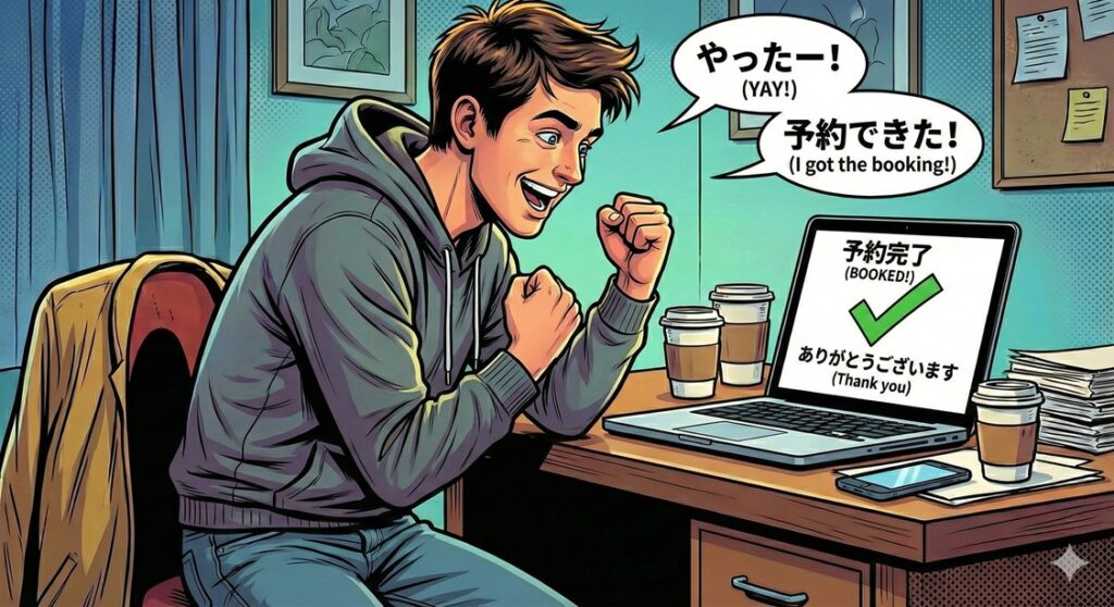 まずは今すぐ、公式サイトの予約ページをブックマークして、一度空席状況をチェックしてみましょう!意外と今、「△」が出ているかもしれませんよ?