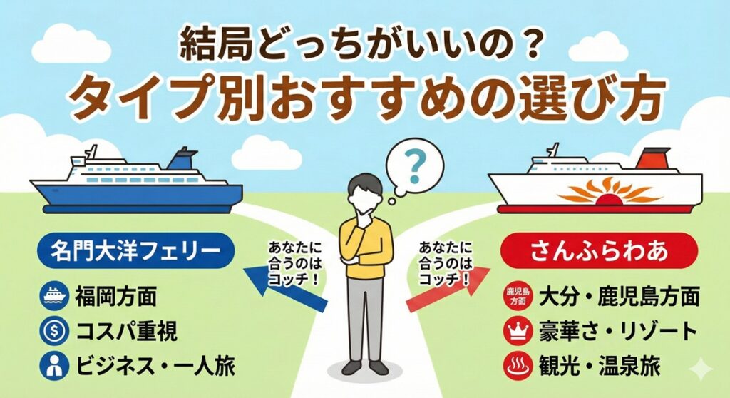 さんふらわあは、「船旅自体が目的」になるような華やかさがあります。別府温泉とセットの旅行プランなど、観光色の強い旅ならさんふらわあが盛り上がるでしょう。
