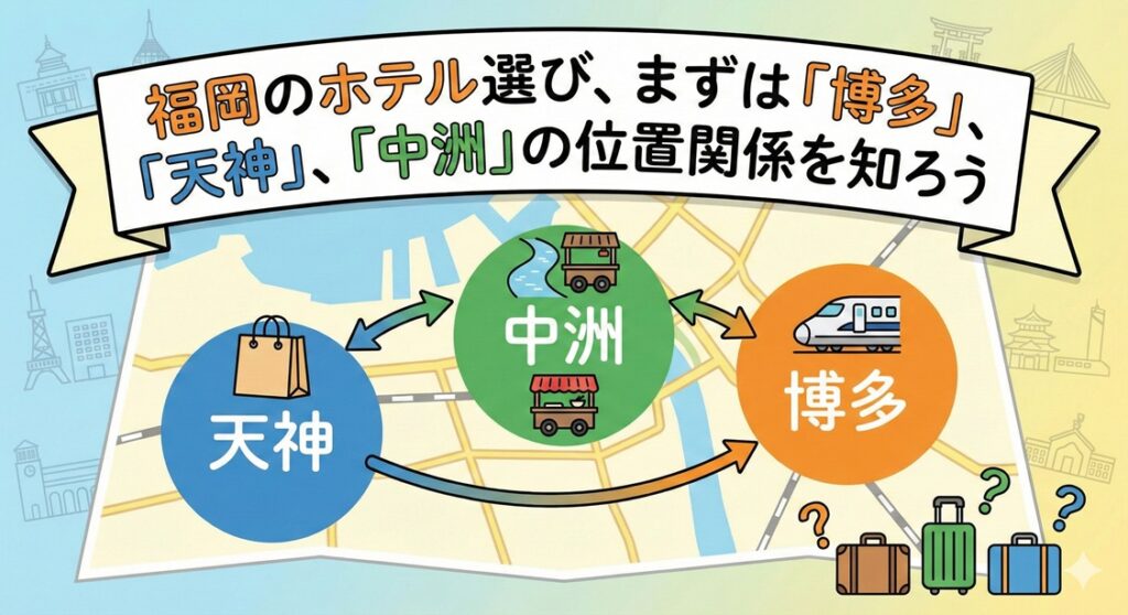 具体的なホテルの紹介に入る前に、福岡の地理をざっくりと把握しておきましょう。福岡旅行の拠点は、大きく以下の3つのエリアに分かれます。