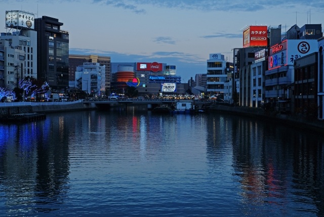 川沿いの情緒ある風景と、近代的なショッピングモールが融合するエリア。夜はネオンが輝き、福岡らしい活気に満ちています。