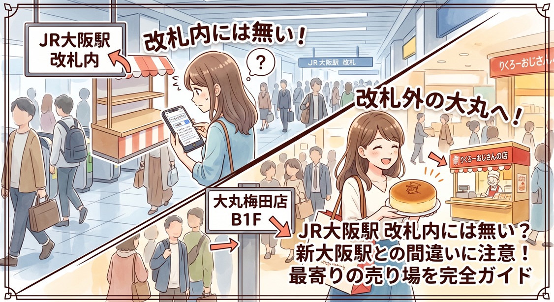 2026年現在、JR大阪駅の改札内(中央口・桜橋口・御堂筋口など全てのエリア)にりくろーおじさんはありません。「乗り換えのついでに改札内で買いたい」と思っても、一度改札を出る必要があるのです。