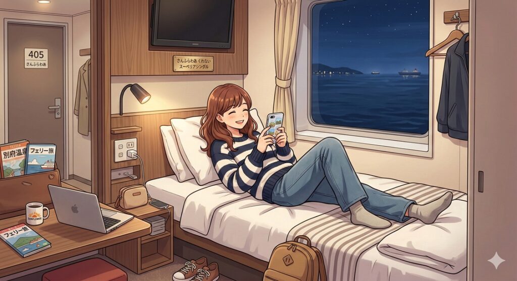 大阪から別府へ向かう「さんふらわあ くれない・むらさき」の船旅。一人部屋を予約すれば、移動の時間が単なる「交通手段」から、非日常を味わえる「極上のリラックスタイム」へと変わります。