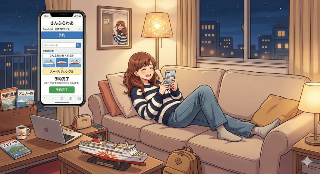 さんふらわあの予約は、通常、乗船日の3ヶ月前の同日午前9時から開始されます。 特に、快適で人気の高い「スーペリアシングル」や、週末・連休の乗船枠は、予約開始直後にあっという間に埋まってしまうことも珍しくありません。「この日に乗る!」と決めたら、3ヶ月前の予約開始日に合わせてWEBサイトにアクセスできるよう準備しておきましょう。