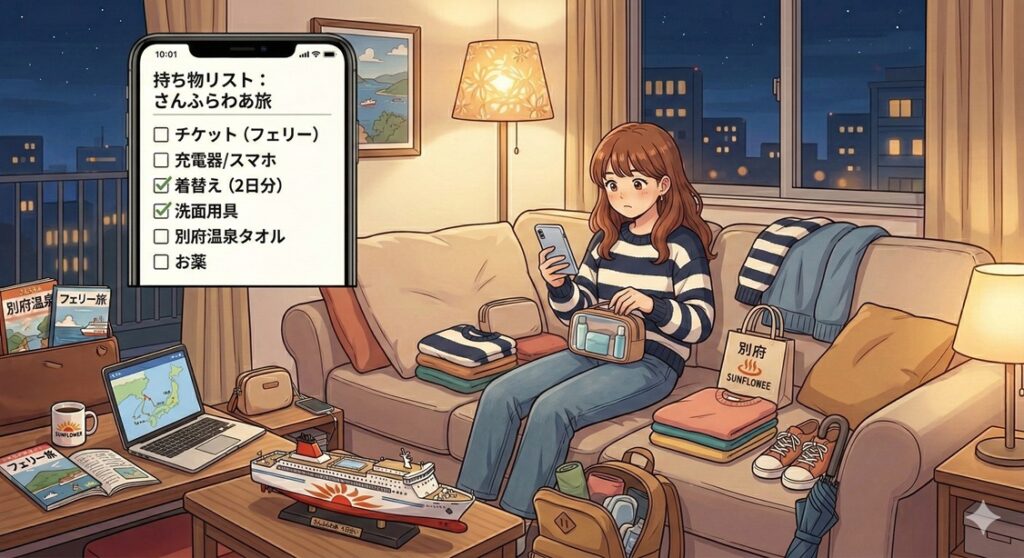 • 酔い止め薬: 大阪〜別府航路(瀬戸内海)は波が穏やかで揺れにくい航路ですが、念のため持っておくと安心です。
