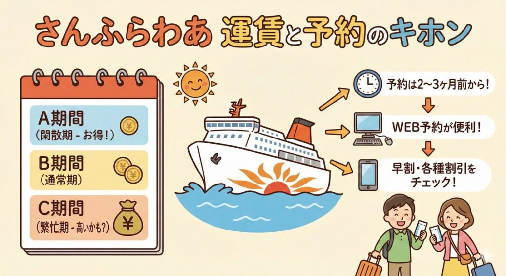 安く乗る方法を知る前に、まずはさんふらわあの「運賃の決まり方」と「予約の仕組み」をサクッと理解しておきましょう。ここを知っているだけでも、旅行計画の立てやすさが格段に変わります。